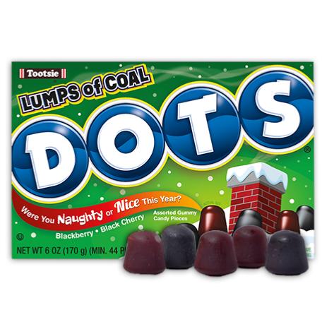 Les Gommes Lumps of Coal Dots sont une édition spéciale pleine d'humour et de gourmandise, inspirée d'une tradition bien connue aux États-Unis : celle du charbon offert aux enfants qui n'ont pas été sages. Présentées dans une boîte de 170 grammes, ces gommes gélifiées aux saveurs intenses de mûre et de cerise noire séduisent par leur originalité et leur goût profond.